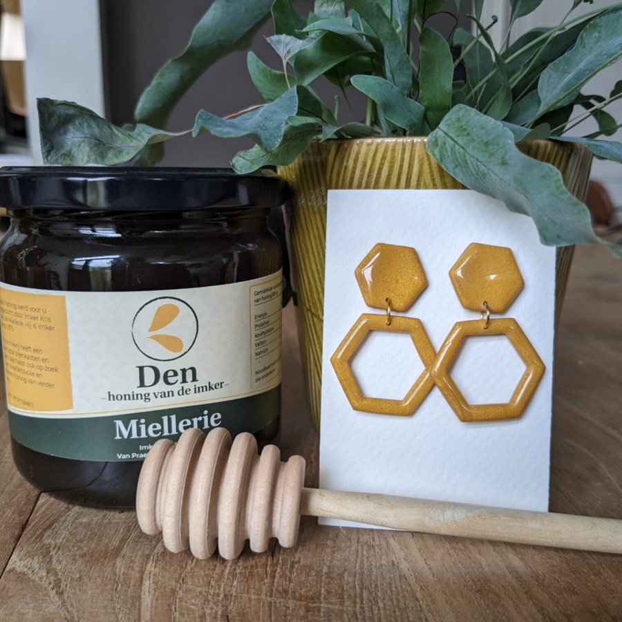 Ik heb me voor deze nieuwe collectie handgemaakte oorbellen laten inspireren door de passie van mijn man nl. bijen en honing. De kleuren en de vormen doen me denken aan de heerlijke goudkleurige honing en honingraten. Het zijn neutrale kleuren die bij heel wat kledingstijlen passen, zowel casual als chique.