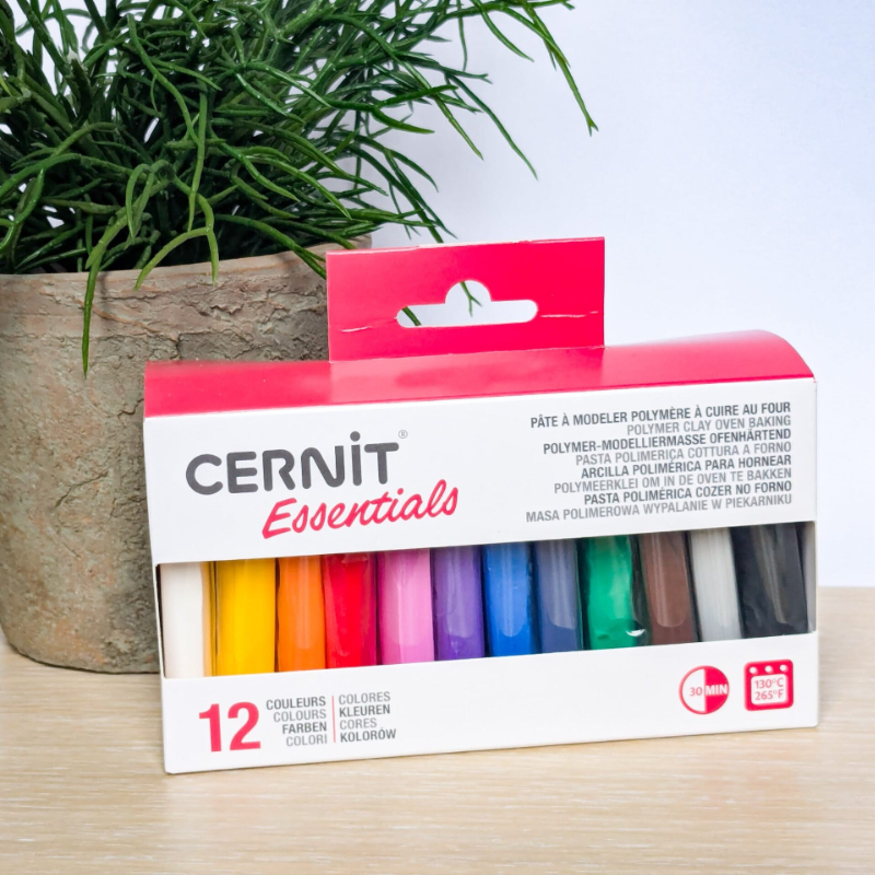 Een assortiment met 12 basiskleuren van Cernit klei in pakjes van 25 gram.